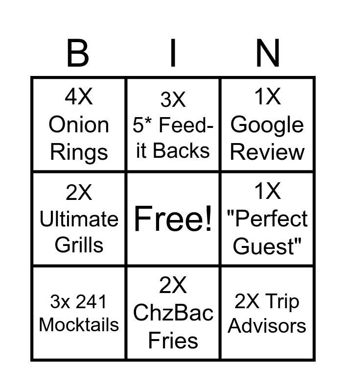 This bingo card has a free space and 8 words: 2X Ultimate Grills, 3X 5* Feed-it Backs, 1X "Perfect Guest", 3x 241 Mocktails, 1X Google Review, 4X Onion Rings, 2X ChzBac Fries and 2X Trip Advisors.
