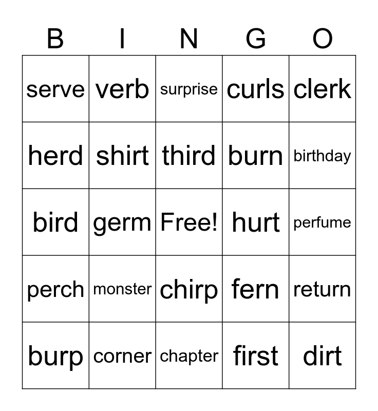 This bingo card has a free space and 36 words: nurse, church, squirt, shirt, fern, perch, third, stir, clerk, burger, germ, curls, twirl, hurt, birthday, serve, spider, monster, dirt, surprise, perfume, return, corner, burp, chapter, verb, bird, third, burn, herd, disturb, lobster, first, chirp, term and sturdy.