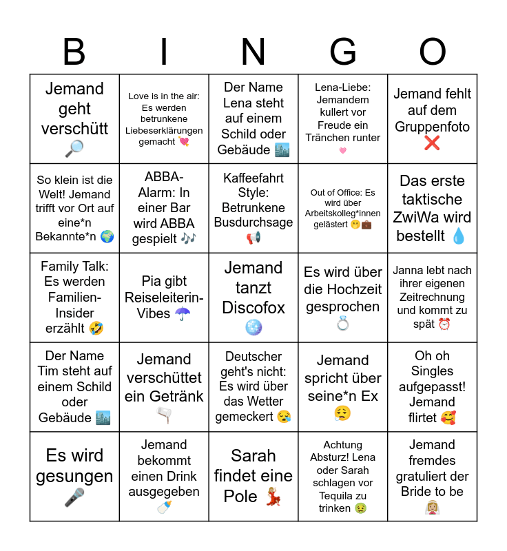 This bingo card has 25 words: Jemand verschüttet ein Getränk 🫗, Sarah findet eine Pole 💃🏼, Kaffeefahrt Style: Betrunkene Busdurchsage 📢, Es wird gesungen 🎤, Jemand fehlt auf dem Gruppenfoto ❌, Jemand geht verschütt 🔎, So klein ist die Welt! Jemand trifft vor Ort auf eine*n Bekannte*n 🌍, Love is in the air: Es werden betrunkene Liebeserklärungen gemacht 💘, Es wird über die Hochzeit gesprochen 💍, Deutscher geht's nicht: Es wird über das Wetter gemeckert 😪, Out of Office: Es wird über Arbeitskolleg*innen gelästert 🫢💼, Family Talk: Es werden Familien-Insider erzählt 🤣, Jemand spricht über seine*n Ex 😮💨, Oh oh Singles aufgepasst! Jemand flirtet 🥰, ABBA-Alarm: In einer Bar wird ABBA gespielt 🎶, Jemand fremdes gratuliert der Bride to be 👰🏼♀️, Janna lebt nach ihrer eigenen Zeitrechnung und kommt zu spät ⏰, Der Name Lena steht auf einem Schild oder Gebäude 🏙️, Das erste taktische ZwiWa wird bestellt 💧, Pia gibt Reiseleiterin-Vibes ☂️, Jemand tanzt Discofox 🪩, Jemand bekommt einen Drink ausgegeben 🍼, Der Name Tim steht auf einem Schild oder Gebäude 🏙️, Lena-Liebe: Jemandem kullert vor Freude ein Tränchen runter 🩷 and Achtung Absturz! Lena oder Sarah schlagen vor Tequila zu trinken 🤢.