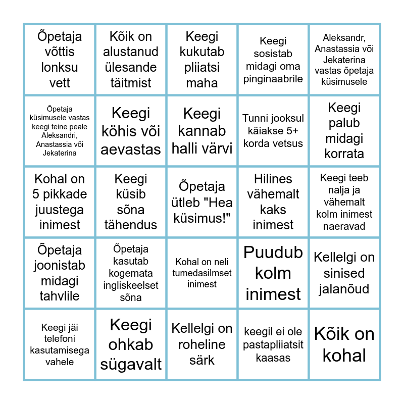 This bingo card has 25 words: Õpetaja kasutab kogemata ingliskeelset sõna, Kellelgi on roheline särk, Keegi kannab halli värvi, Keegi jäi telefoni kasutamisega vahele, Aleksandr, Anastassia või Jekaterina vastas õpetaja küsimusele, Õpetaja võttis lonksu vett, Õpetaja küsimusele vastas keegi teine peale Aleksandri, Anastassia või Jekaterina, Kõik on alustanud ülesande täitmist, Hilines vähemalt kaks inimest, Kohal on neli tumedasilmset inimest, Tunni jooksul käiakse 5+ korda vetsus, Kohal on 5 pikkade juustega inimest, Puudub kolm inimest, Kellelgi on sinised jalanõud, Keegi köhis või aevastas, Kõik on kohal, Keegi teeb nalja ja vähemalt kolm inimest naeravad, Keegi kukutab pliiatsi maha, Keegi palub midagi korrata, Keegi küsib sõna tähendus, Õpetaja ütleb "Hea küsimus!", Keegi ohkab sügavalt, Õpetaja joonistab midagi tahvlile, Keegi sosistab midagi oma pinginaabrile and keegil ei ole pastapliiatsit kaasas.