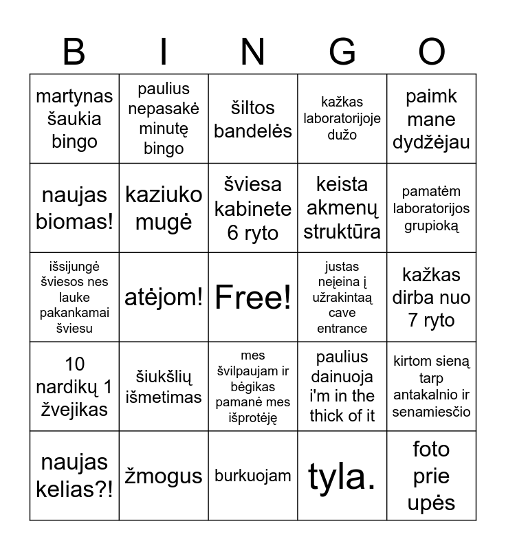 This bingo card has a free space and 24 words: šiukšlių išmetimas, žmogus, šviesa kabinete 6 ryto, naujas kelias?!, paimk mane dydžėjau, martynas šaukia bingo, naujas biomas!, paulius nepasakė minutę bingo, justas neįeina į užrakintaą cave entrance, mes švilpaujam ir bėgikas pamanė mes išprotėję, keista akmenų struktūra, išsijungė šviesos nes lauke pakankamai šviesu, paulius dainuoja i'm in the thick of it, kirtom sieną tarp antakalnio ir senamiesčio, kaziuko mugė, tyla., kažkas dirba nuo 7 ryto, šiltos bandelės, pamatėm laboratorijos grupioką, atėjom!, foto prie upės, 10 nardikų 1 žvejikas, kažkas laboratorijoje dužo and burkuojam.