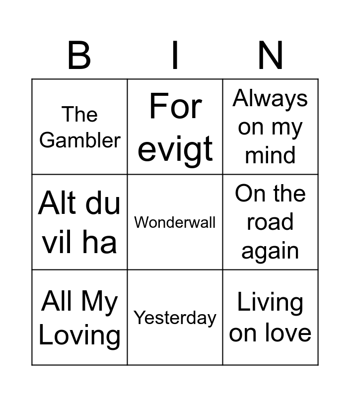 This bingo card has 27 words: Ring of Fire, The Dance, Living on love, Friends in low places, On the road again, Always on my mind, For evigt, Natteravn, Me to går alltid aleine, Naboen, Min drømmesang, Alt du vil ha, Another Brick in the wall, Brown girl in the ring, Brown eyed girl, Help!, All My Loving, Yesterday, Tigergutt, The Gambler, This is my life, Mamma Mia, Silikon i patti, Onkel Pers kjøkkenbord, 500 miles, Wonderwall and Don't look back in anger.