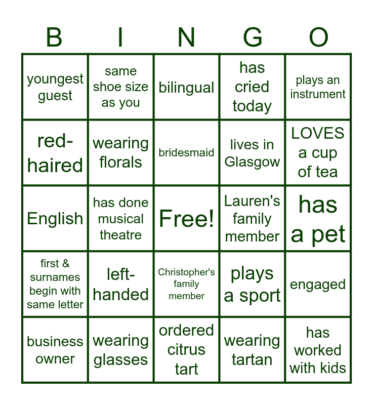 This bingo card has a free space and 24 words: left-handed, wearing glasses, bridesmaid, business owner, plays an instrument, youngest guest, red-haired, same shoe size as you, Lauren's family member, Christopher's family member, lives in Glasgow, English, plays a sport, engaged, wearing florals, wearing tartan, has a pet, bilingual, LOVES a cup of tea, has done musical theatre, has worked with kids, first & surnames begin with same letter, has cried today and ordered citrus tart.