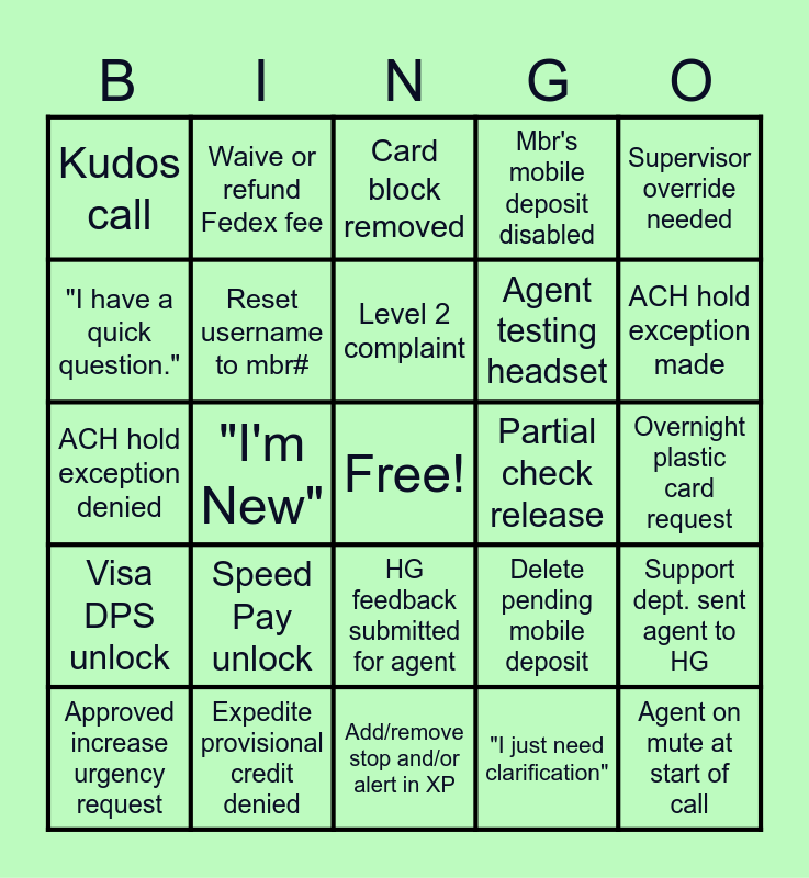 This bingo card has a free space and 24 words: Speed Pay unlock, Expedite provisional credit denied, Level 2 complaint, Approved increase urgency request, Supervisor override needed, Kudos call, "I have a quick question.", Waive or refund Fedex fee, Partial check release, HG feedback submitted for agent, Agent testing headset, ACH hold exception denied, Delete pending mobile deposit, Support dept. sent agent to HG, Reset username to mbr#, "I just need clarification", Overnight plastic card request, Card block removed, ACH hold exception made, "I'm New", Agent on mute at start of call, Visa DPS unlock, Mbr's mobile deposit disabled and Add/remove stop and/or alert in XP.