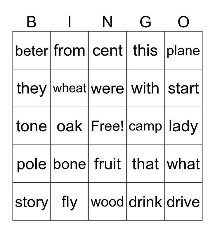 This bingo card has a free space and 29 words: story, shore, oak, hour, beter, cent, wheat, bone, camp, fly, lady, drive, wood, drink, start, head, fruit, pole, plane, tone, that, was, with, they, this, from, what, were and when.