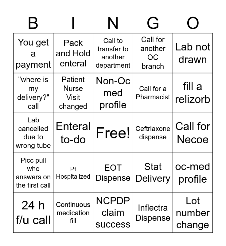 This bingo card has a free space and 24 words: Pt Hospitalized, Continuous medication fill, Non-Oc med profile, 24 h f/u call, Lab not drawn, You get a payment, "where is my delivery?" call, Pack and Hold enteral, Ceftriaxone dispense, EOT Dispense, Call for a Pharmacist, Lab cancelled due to wrong tube, Stat Delivery, oc-med profile, Patient Nurse Visit changed, Inflectra Dispense, Call for Necoe, Call to transfer to another department, fill a relizorb, Enteral to-do, Lot number change, Picc pull who answers on the first call, Call for another OC branch and NCPDP claim success.