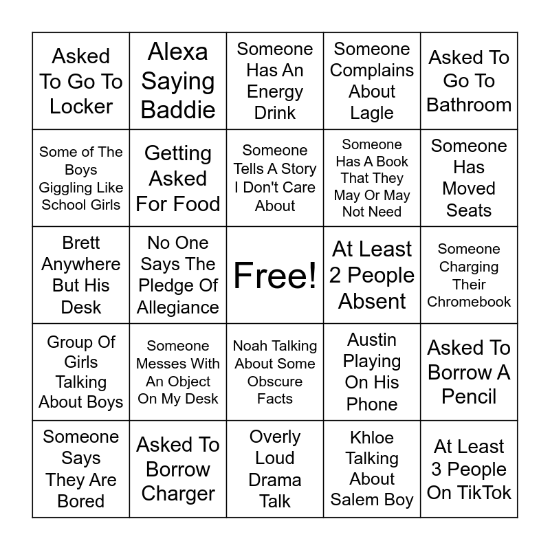 This bingo card has a free space and 24 words: Someone Messes With An Object On My Desk, Asked To Borrow Charger, Someone Tells A Story I Don't Care About, Someone Says They Are Bored, Asked To Go To Bathroom, Asked To Go To Locker, Some of The Boys Giggling Like School Girls, Alexa Saying Baddie, At Least 2 People Absent, Noah Talking About Some Obscure Facts, Someone Has A Book That They May Or May Not Need, Brett Anywhere But His Desk, Austin Playing On His Phone, Asked To Borrow A Pencil, Getting Asked For Food, Khloe Talking About Salem Boy, Someone Charging Their Chromebook, Someone Has An Energy Drink, Someone Has Moved Seats, No One Says The Pledge Of Allegiance, At Least 3 People On TikTok, Group Of Girls Talking About Boys, Someone Complains About Lagle and Overly Loud Drama Talk.