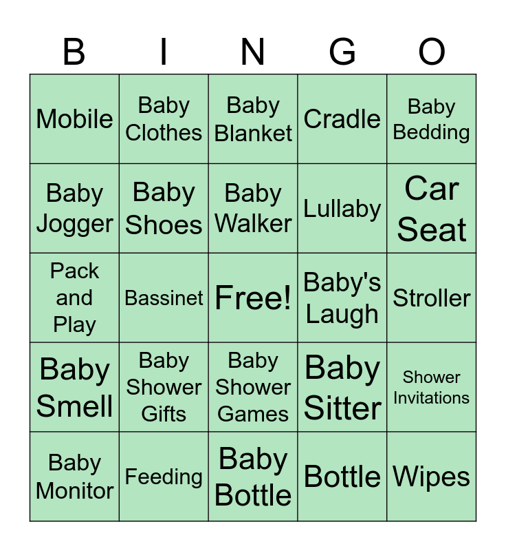 This bingo card has a free space and 52 words: Registry, Wipes, Baby Bath, Baby Bottle, Baby Shower Gifts, Baby Carrier, Baby Clothes, Baby Food, Baby Jogger, Bath Time, Baby Shoes, Baby Shower, Shower Invitations, Baby Sitter, Baby Swing, Baby Toys, Baby Walker, Baby's Laugh, Play Pen, Baby Bedding, Bassinet, Bottle, Mobile, Lullaby, Bibs, Booties, Bouncer Seat, Cravings, Car Seat, Changing Table, Cloth Diaper, Cradle, Crib, Diapers, Diaper Bag, Baby Blanket, Feeding, Ultrasound, Formula, High Chair, Infant Carrier, Stroller, Baby Smell, Cooing, Baby Shower Games, Breast Milk, Onesie, Pack and Play, Boppy, Receiving Blanket, Baby Monitor and Pacifier.