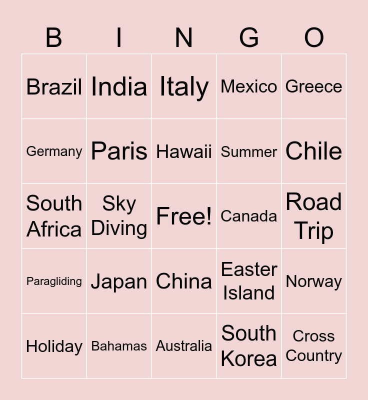 This bingo card has a free space and 36 words: Passport, Vacation, Swimming, Summer, Cross Country, Holiday, Japan, France, Mexico, Water Park, Paragliding, Sky Diving, Mountain Climbing, Road Trip, South Africa, India, Australia, Canada, Chile, Brazil, Bahamas, Hawaii, Easter Island, Morocco, Egypt, Paris, Italy, Rome, Greece, Germany, Popsicle, China, South Korea, Norway, Thailand and ATL!.