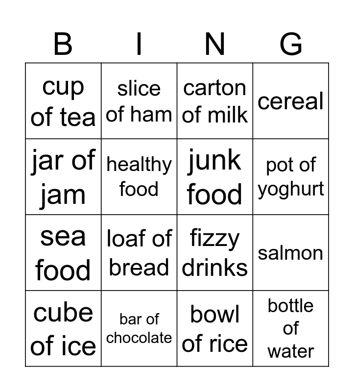 This bingo card has 16 words: bar of chocolate, salmon, carton of milk, cup of tea, sea food, slice of ham, fizzy drinks, bowl of rice, jar of jam, healthy food, cube of ice, cereal, loaf of bread, pot of yoghurt, junk food and bottle of water.