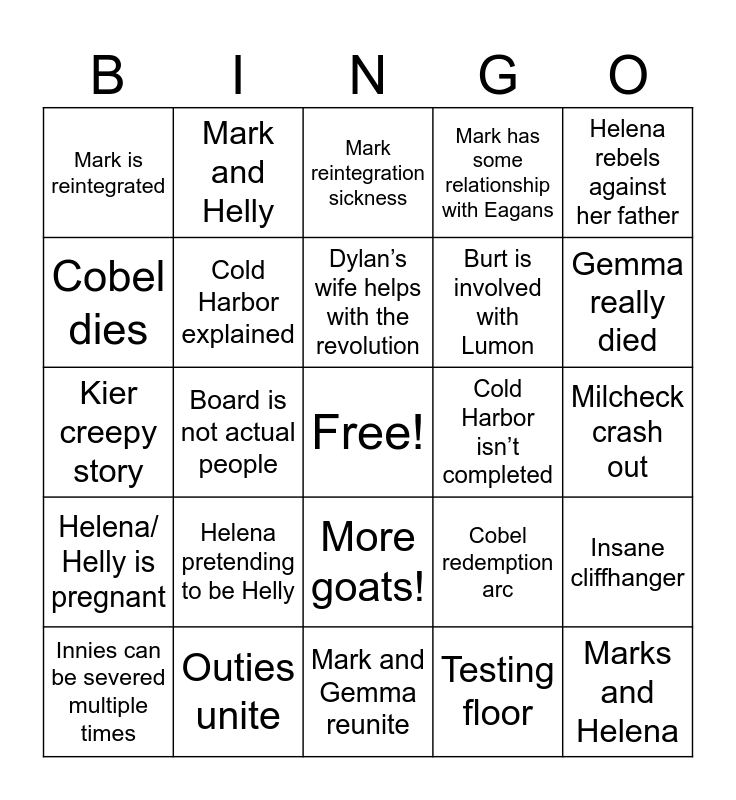 This bingo card has a free space and 24 words: Helena pretending to be Helly, Outies unite, Dylan’s wife helps with the revolution, Innies can be severed multiple times, Helena rebels against her father, Mark is reintegrated, Cobel dies, Mark and Helly, Cold Harbor isn’t completed, More goats!, Burt is involved with Lumon, Kier creepy story, Cobel redemption arc, Insane cliffhanger, Cold Harbor explained, Testing floor, Milcheck crash out, Mark reintegration sickness, Gemma really died, Board is not actual people, Marks and Helena, Helena/ Helly is pregnant, Mark has some relationship with Eagans and Mark and Gemma reunite.