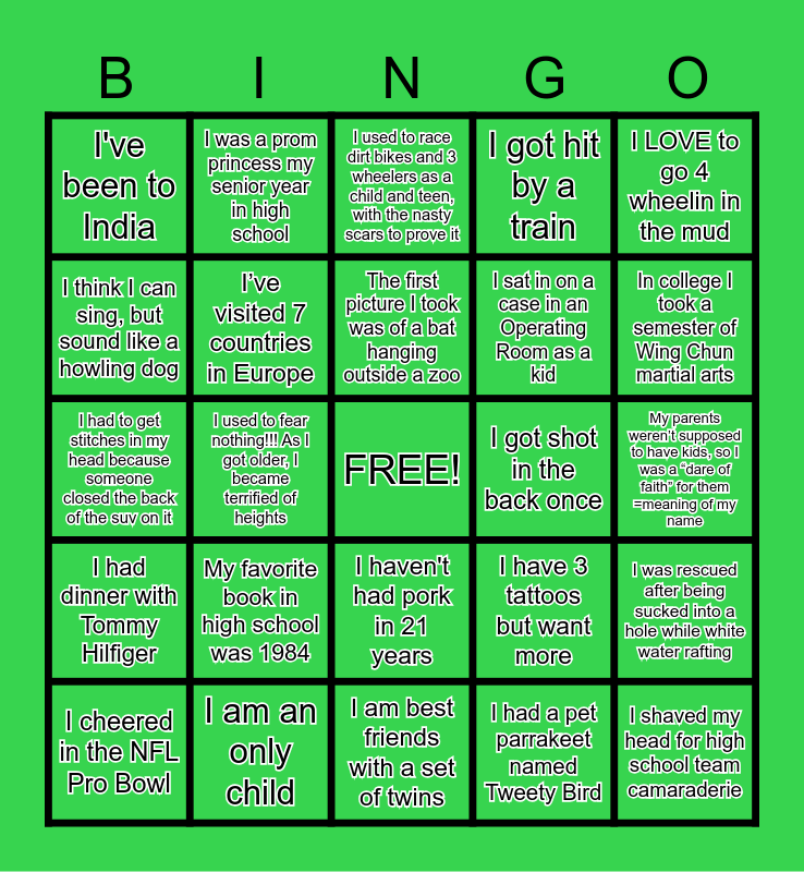 This bingo card has a free space and 24 words: My favorite book in high school was 1984, I am an only child, The first picture I took was of a bat hanging outside a zoo, I cheered in the NFL Pro Bowl, I LOVE to go 4 wheelin in the mud, I've been to India, I think I can sing, but sound like a howling dog, I was a prom princess my senior year in high school, I got shot in the back once, I haven't had pork in 21 years, I sat in on a case in an Operating Room as a kid, I had to get stitches in my head because someone closed the back of the suv on it, I have 3 tattoos but want more, I was rescued after being sucked into a hole while white water rafting, I’ve visited 7 countries in Europe, I had a pet parrakeet named Tweety Bird, My parents weren’t supposed to have kids, so I was a “dare of faith” for them =meaning of my name, I used to race dirt bikes and 3 wheelers as a child and teen, with the nasty scars to prove it, In college I took a semester of Wing Chun martial arts, I used to fear nothing!!! As I got older, I became terrified of heights, I shaved my head for high school team camaraderie, I had dinner with Tommy Hilfiger, I got hit by a train and I am best friends with a set of twins.