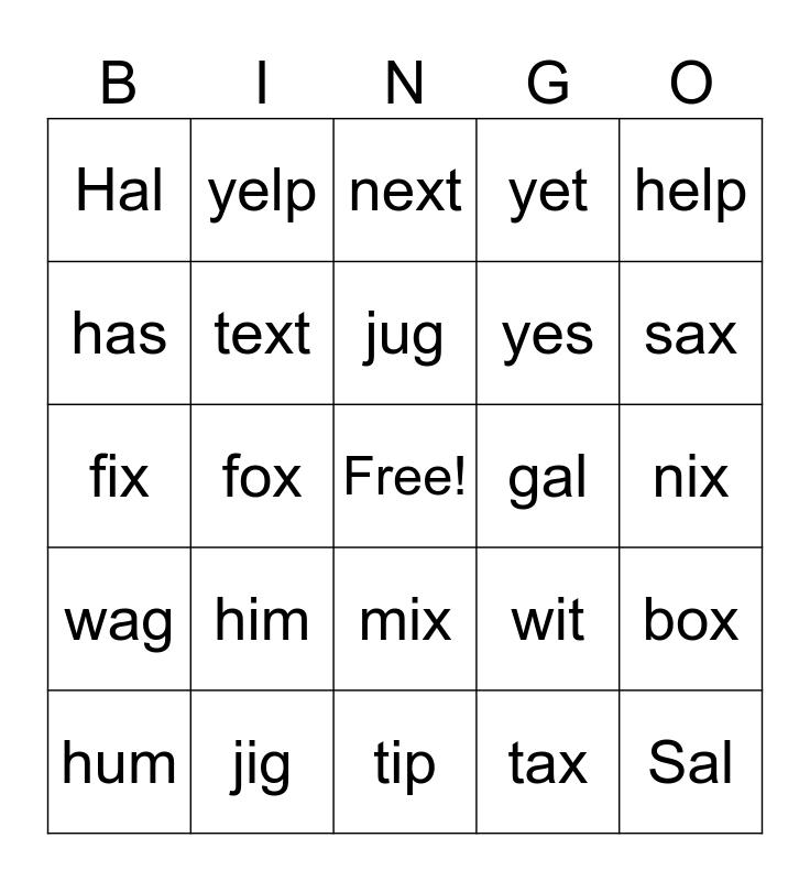 This bingo card has a free space and 32 words: tax, hug, fox, yak, wag, text, help, box, yelp, wax, jug, next, jump, jam, gal, pal, hum, fix, mix, him, wit, wig, nix, jig, Sal, yet, yes, has, Hal, tip, sip and sax.