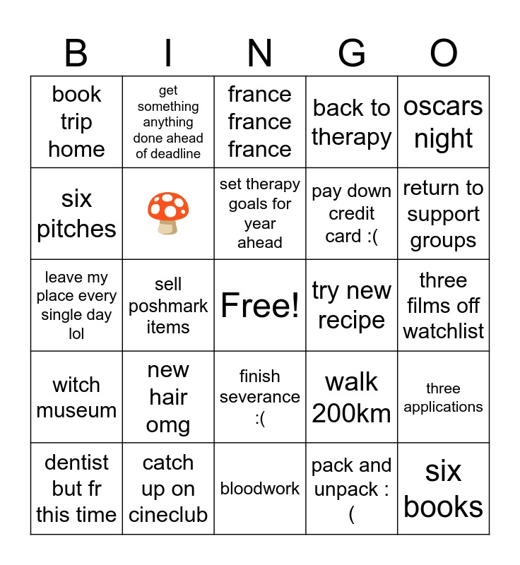 This bingo card has a free space and 24 words: new hair omg, catch up on cineclub, set therapy goals for year ahead, dentist but fr this time, oscars night, book trip home, six pitches, get something anything done ahead of deadline, try new recipe, finish severance :(, pay down credit card :(, leave my place every single day lol, walk 200km, three applications, 🍄, pack and unpack :(, three films off watchlist, france france france, return to support groups, sell poshmark items, six books, witch museum, back to therapy and bloodwork.