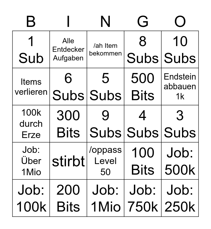 This bingo card has 25 words: stirbt, Job: 1Mio, 5 Subs, Job: 100k, 10 Subs, 1 Sub, Items verlieren, Alle Entdecker Aufgaben, 4 Subs, /oppass Level 50, 500 Bits, 100k durch Erze, 100 Bits, Job: 500k, 6 Subs, Job: 250k, 3 Subs, /ah Item bekommen, Endstein abbauen 1k, 300 Bits, 9 Subs, 200 Bits, Job: Über 1Mio, 8 Subs and Job: 750k.