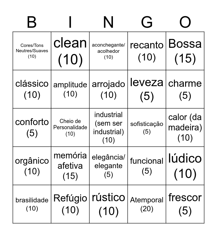 This bingo card has 30 words: Refúgio (10), marcante (5), Cheio de Personalidade (10), Imponente (15), Cores/Tons Neutres/Suaves (10), aconchegante/ acolhedor (10), amplitude (10), elegância/ elegante (5), sofisticação (5), rústico (10), calor (da madeira) (10), industrial (sem ser industrial) (10), Atemporal (20), frescor (5), charme (5), cada detalhe (5), funcional (5), orgânico (10), memória afetiva (15), Bossa (15), conforto (5), iluminação indireta (5), clean (10), leveza (5), clássico (10), recanto (10), lúdico (10), brasilidade (10), arrojado (10) and encantador (5).