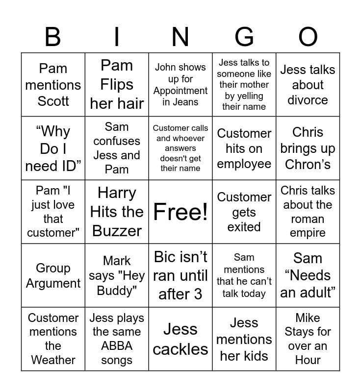 This bingo card has a free space and 81 words: These are nice Pens, Customer says "You're all alone here?", John shows up for Appointment in Jeans, Customer has Colored Hair, Customer wearing Shorts, Bald Customer, Byrne Dairy needs official check, Shelly rants about byrne dairy, Mary Joe from DG has her hood up, Customer brings up Michelle(Not Daryle), Customer says " I got my pick of people today", Pam gets mad at the Cleaner/Snowplow guy, Jess talks to someone like their mother by yelling their name, Pam mentions Scott, Everyone knows me here, “Why Do I need ID”, Someone calls one of us by the wrong name, Mark says "Hey Buddy", Ron texts Jess after he leaves, Chris talks about the roman empire, Chris says how much he like/loves hunter, Jess talks about divorce, Pam "I just love that customer", Customer calls and whoever answers doesn't get their name, Sam confuses Jess and Pam, Customer goes on political rant, Someone says Pam is the manager, Someone needs a Money Order, Someone wants a debit card printed in branch, Jennifer Thorpe hands us a deposit and immediately leaves, Chris brings up Chron’s, Chris mentions his glasses, Jess cackles, TCR has under 10K in Hundreds, Customer mentions the Weather, Customer gets exited, Customer has delinquency, Customer claims they don't know how they over drafted when they did it to themselves, Customer says they have fraud but they did the transaction once you talk to them about it, Ron comes in and goes directly to Jess's Office, Mike Stays for over an Hour, Customer says they dont know anyone, anymore, Ricky Thorpe makes sarcastic comment to Pam, Daryle sits down to talk in an office, Harry Hits the Buzzer, Wendy Duck comes in for Pam, Pam Flips her hair, Jess says her tummy hurts, Chris makes a B-line for the back, Jim Lafluer confuses Hannah, Sam mentions that he can’t talk today, Sam “Needs an adult”, Customer wants to cash a check over 5000, Chris goes on a rant about a random topic for no reason, ATM goes out of service, Customer needs a new Debit Card, Notary is asked for, Paula from Kinney’s does the dots, Card Stuck in ATM, Jess asks for a Celsius, Bic isn’t ran until after 3, Adult takes a Lollipop, Safe Deposit Box, Customer wants to steal a pen, Pam talks about her dad, Customer Lurks to wait for a Banker, Sam Wears Boots, Jess gets Sam and Chris confused, Jess’s mother-in-law calls, Jess Mentions Target, Somebody says they don’t “Trust that machine” and counts the money, Group Argument, Jess plays the same ABBA songs, Hunter calls Jess, Pam threatens the underwriters, Hannah mentions indie, Jess sends someone else for food, Jess mentions her kids, Hannah gets heated at her neighbors, Customer hits on employee and Customer comments on Sam & Chris being similar.