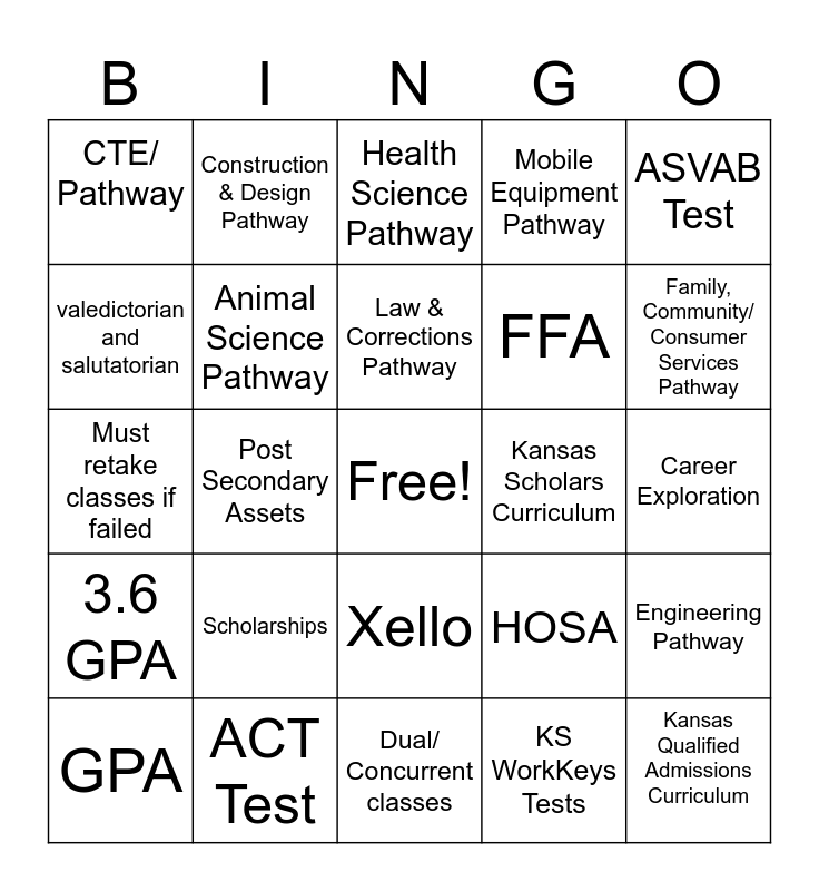 This bingo card has a free space and 29 words: GPA, 28 Total Credits for Graduation, Post Secondary Assets, IPS (individual plan of study), CTE/ Pathway, Health Science Pathway, Animal Science Pathway, Scholarships, Kansas Scholars Curriculum, ACT Test, Career Exploration, Kansas Qualified Admissions Curriculum, Dual/ Concurrent classes, KS WorkKeys Tests, Family, Community/ Consumer Services Pathway, FCCLA, Xello, 3.6 GPA, ASVAB Test, Must retake classes if failed, HOSA, 4.0 GPA, FFA, valedictorian and salutatorian, Mobile Equipment Pathway, Construction & Design Pathway, Engineering Pathway, Law & Corrections Pathway and Credits.