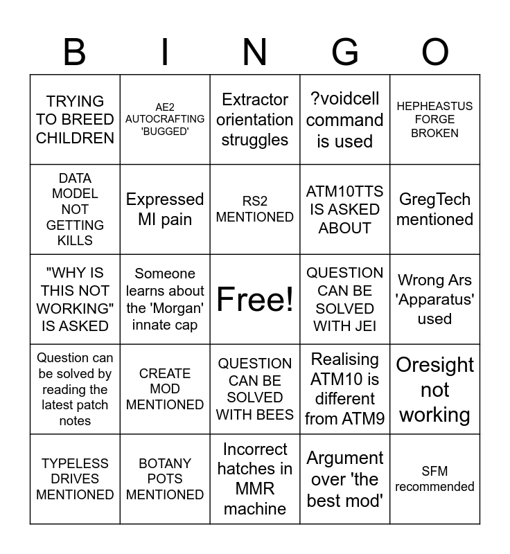 This bingo card has a free space and 24 words: CREATE MOD MENTIONED, BOTANY POTS MENTIONED, RS2 MENTIONED, TYPELESS DRIVES MENTIONED, HEPHEASTUS FORGE BROKEN, TRYING TO BREED CHILDREN, DATA MODEL NOT GETTING KILLS, AE2 AUTOCRAFTING 'BUGGED', QUESTION CAN BE SOLVED WITH JEI, QUESTION CAN BE SOLVED WITH BEES, ATM10TTS IS ASKED ABOUT, "WHY IS THIS NOT WORKING" IS ASKED, Realising ATM10 is different from ATM9, Oresight not working, Expressed MI pain, Argument over 'the best mod', Wrong Ars 'Apparatus' used, Extractor orientation struggles, GregTech mentioned, Someone learns about the 'Morgan' innate cap, SFM recommended, Question can be solved by reading the latest patch notes, ?voidcell command is used and Incorrect hatches in MMR machine.