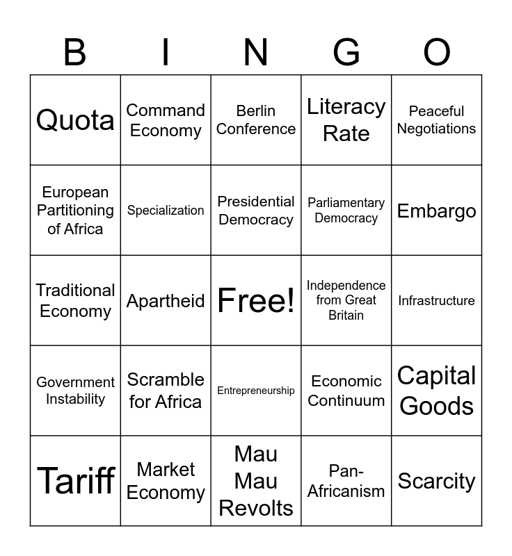 This bingo card has a free space and 24 words: Scramble for Africa, Market Economy, Presidential Democracy, Tariff, Peaceful Negotiations, Quota, European Partitioning of Africa, Command Economy, Independence from Great Britain, Entrepreneurship, Parliamentary Democracy, Traditional Economy, Economic Continuum, Capital Goods, Specialization, Pan-Africanism, Infrastructure, Berlin Conference, Embargo, Apartheid, Scarcity, Government Instability, Literacy Rate and Mau Mau Revolts.