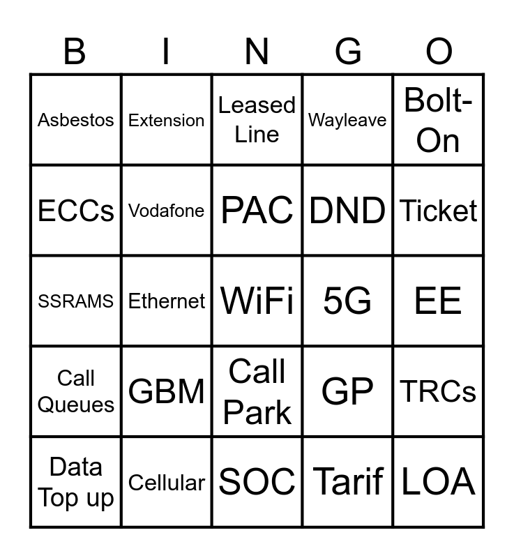 This bingo card has 80 words: Samsung, Avaya, Leased Line, DDI, Roaming, Fibre, SIM, Splicing, Porting, CLI, Teams Plan, DIA, Wayleave, Asbestos, Yealink, ECCs, Adva, GBM, iPhone, EE, Ducts, Bolt-On, SSRAMS, PAC, Vodafone, Survey, SIM Swap, QBR, Bill Review, Disti, Ticket, PO, SOC, LOA, Data Top up, 5G, Data, Divert, Voicemail, WiFi, 4G, International, Minutes, Bars, Cost centres, Extension, Hunt Group, ATA, IVR, Hotdesk, TRCs, Ethernet, GP, Margin, ACD, Time Schedule, Ring Groups, Sim Ring, Round Robin, Call Park, DND, Blocklist, Whitelist, Config, Contact Centre, UCaaS, Conference, EFAX, Speed Dial, Directory, Call Queues, Cellular, Out of Bundle, Zoning, Spend Cap, Alerts, Tarif, Triggered Charge, Multinet and Bundles.