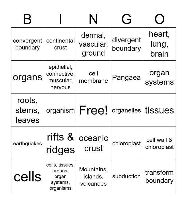 This bingo card has a free space and 24 words: cells, rifts & ridges, cell membrane, subduction, heart, lung, brain, convergent boundary, continental crust, dermal, vascular, ground, organelles, tissues, roots, stems, leaves, epithelial, connective, muscular, nervous, chloroplast, cell wall & chloroplast, organs, cells, tissues, organs, organ systems, organisms, Mountains, islands, volcanoes, divergent boundary, organ systems, earthquakes, organism, oceanic crust, Pangaea and transform boundary.