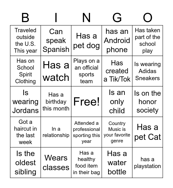This bingo card has a free space and 24 words: In a relationship, Wears classes, Plays on a an official sports team, Is the oldest sibling, Has taken part of the school play, Traveled outside the U.S. This year, Has on School Spirit Clothing, Can speak Spanish, Is an only child, Attended a professional sporting this year, Has created a Tik/Tok, Is wearing Jordans, Country Music is your favorite genre, Has a pet Cat, Has a watch, Has a water bottle, Is on the honor society, Has a pet dog, Is wearing Adidas Sneakers, Has a birthday this month, has a playstation, Got a haircut in the last week, has an Android phone and Has a healthy food item in their bag.
