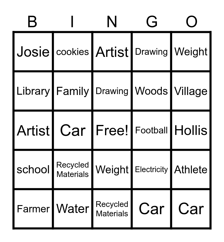 ⚠ This card has duplicate items: Football (2), Blue (2), Weight (2), Jazz (2), cookies (2), Science (4), Little man (2), Respect (2), Singing (2), school (2), lunchroom (2), Music (2), Athlete (2), Hollis (2), Woods (2), Drawing (2), Family (2), Josie (2), Driving (2), Home (2), Sketchbook (2), Cabin (2), Artist (2), New York (2), Car (4), Winter (2), Malawi (2), Famine (2), Books (2), Farmer (2), Water (2), Windmill (2), Drought (2), Recycled Materials (2), Library (2), Maize (2), Village (2), Wind (2), Radios (2), Electricity (2), Water Pump (2)