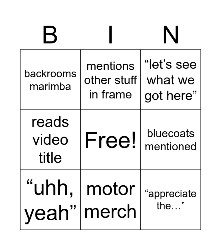 This bingo card has a free space and 8 words: bluecoats mentioned, “let’s see what we got here”, mentions other stuff in frame, “uhh, yeah”, backrooms marimba, “appreciate the…”, reads video title and motor merch.