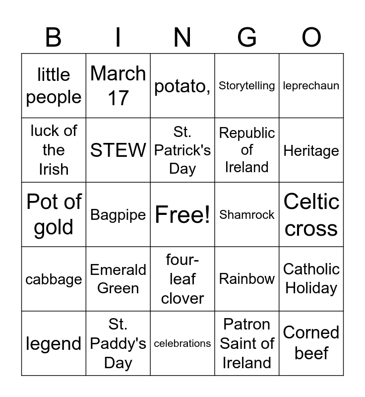 This bingo card has a free space and 24 words: Emerald Green, St. Paddy's Day, St. Patrick's Day, legend, leprechaun, little people, luck of the Irish, March 17, Shamrock, four-leaf clover, Republic of Ireland, Pot of gold, Rainbow, Catholic Holiday, STEW, Patron Saint of Ireland, Celtic cross, potato,, Heritage, Bagpipe, Corned beef, cabbage, Storytelling and celebrations.