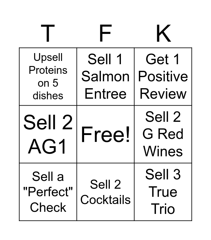 This bingo card has a free space and 8 words: Sell 2 G Red Wines, Get 1 Positive Review, Sell 1 Salmon Entree, Sell a "Perfect" Check, Upsell Proteins on 5 dishes, Sell 3 True Trio, Sell 2 AG1 and Sell 2 Cocktails.
