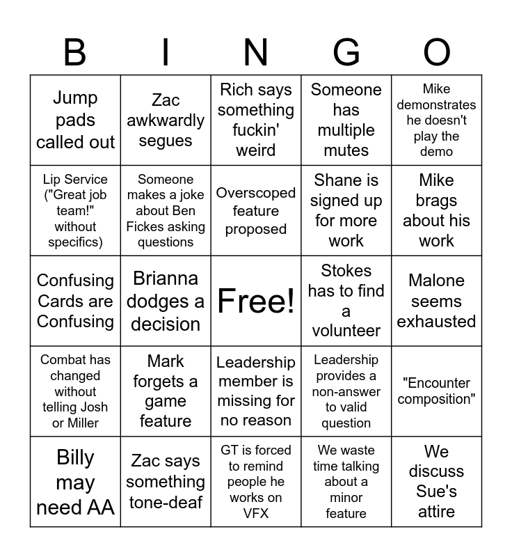 This bingo card has a free space and 29 words: Billy may need AA, "Awesome", Brianna dodges a decision, Awkward Silence, Jump pads called out, Rich says something fuckin' weird, Someone makes a joke about Ben Fickes asking questions, Mark forgets a game feature, Stokes has to find a volunteer, Zac says something tone-deaf, Malone seems exhausted, We discuss Sue's attire, GT is forced to remind people he works on VFX, We waste time talking about a minor feature, Mike brags about his work, False positivity about studio not closing, Leadership member is missing for no reason, Combat has changed without telling Josh or Miller, Mike demonstrates he doesn't play the demo, Confusing Cards are Confusing, Leadership provides a non-answer to valid question, Mike tries to force his work to be used, Shane is signed up for more work, Lip Service ("Great job team!" without specifics), Someone has multiple mutes, Zac awkwardly segues, "Encounter composition", Overscoped feature proposed and How many cameras are on mentioned.