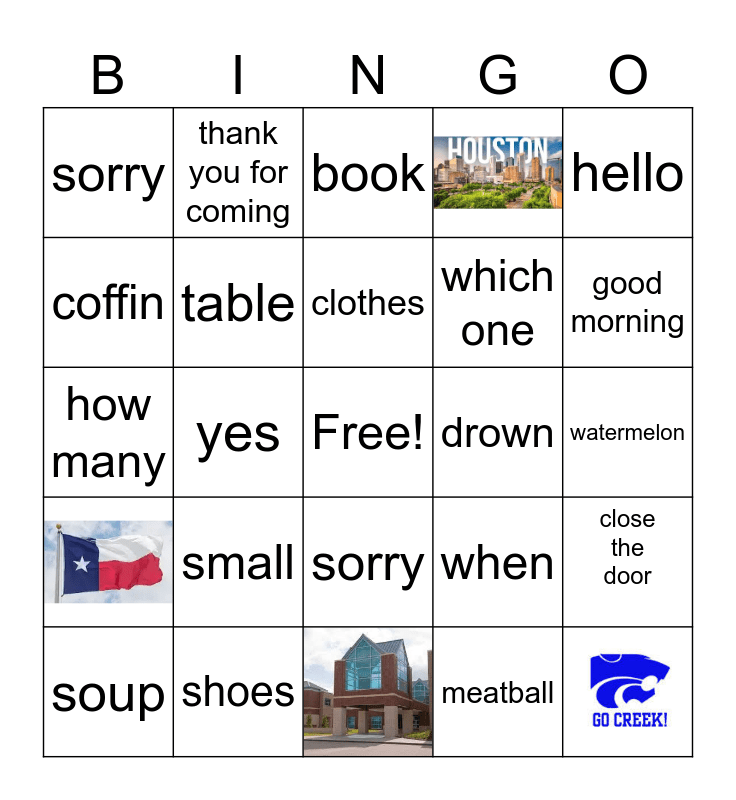 This bingo card has 4 images, a free space and 20 words: small, shoes, clothes, soup, hello, sorry, coffin, thank you for coming, drown, sorry, which one, how many, when, close the door, table, meatball, watermelon, book, good morning and yes.