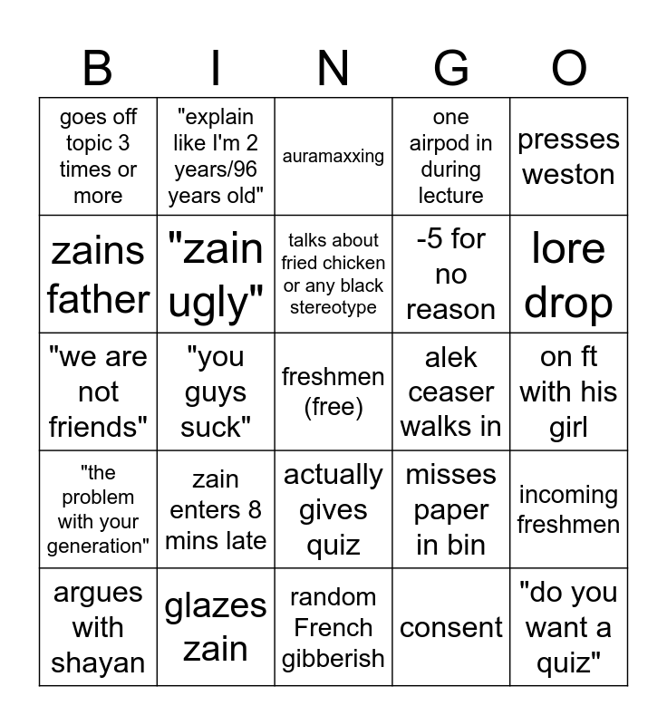 This bingo card has a free space and 24 words: zain enters 8 mins late, glazes zain, talks about fried chicken or any black stereotype, argues with shayan, presses weston, goes off topic 3 times or more, zains father, "explain like I'm 2 years/96 years old", alek ceaser walks in, actually gives quiz, -5 for no reason, "we are not friends", misses paper in bin, incoming freshmen, "zain ugly", consent, on ft with his girl, auramaxxing, lore drop, "you guys suck", "do you want a quiz", "the problem with your generation", one airpod in during lecture and random French gibberish.