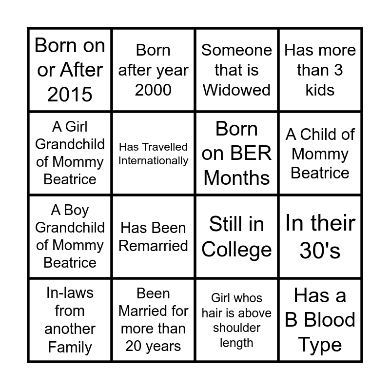 This bingo card has 16 words: In-laws from another Family, Been Married for more than 20 years, Someone that is Widowed, Has more than 3 kids, A Girl Grandchild of Mommy Beatrice, Born after year 2000, Still in College, In their 30's, Born on or After 2015, Has Travelled Internationally, Girl whos hair is above shoulder length, A Child of Mommy Beatrice, A Boy Grandchild of Mommy Beatrice, Has Been Remarried, Born on BER Months and Has a B Blood Type.