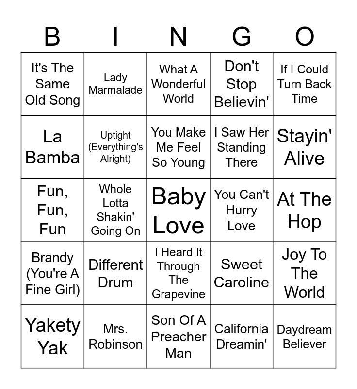 This bingo card has 90 words: Wake Me Up Before You Go-Go, Dancing Queen, I Heard It Through The Grapevine, That's Amore, You're The First, The Last, My Everything, Your Song, You're So Vain, (Your Love Keeps Lifting Me) Higher & Higher, Mack The Knife, I Want To Hold Your Hand, I Wanna Dance With Somebody (Who Loves Me), Theme From New York, New York, War, At The Hop, Oh, Pretty Woman, You Make Me Feel So Young, Bad Moon Rising, All I Have To Is Dream, Play That Funky Music, Jailhouse Rock, Superstition, Johnny B. Goode, Son Of A Preacher Man, Beyond The Sea, Fun, Fun, Fun, Mrs. Robinson, Chantilly Lace, Just The Way You Are, Stand By Your Man, Take Me Home, Country Roads, I Will Survive, Joy To The World, Earth Angel (Will You Be Mine), Brandy (You're A Fine Girl), It's The Same Old Song, Don't Stop Believin', What A Wonderful World, Livin' On A Prayer, Whole Lotta Shakin' Going On, Stayin' Alive, Yakety Yak, La Bamba, Stand By Me, Leader Of The Pack, All Night Long, Sweet Caroline, Piano Man, Saturday In The Park, These Boots Are Made For Walkin', We Will Rock You, The Tracks Of My Tears, I Saw Her Standing There, Midnight Train To Georgia, Rocket Man, Lean On Me, Suspicious Minds, You Can't Hurry Love, Tutti Frutti, (We're Gonna) Rock Around The Clock, All Shook Up, Don't Go Breaking My Heart, Tequila, It's Raining Men, Y.M.C.A., September (Do You Remember), Rhinestone Cowboy, Then He Kissed Me, California Dreamin', The Great Pretender, Let's Get It On, Different Drum, Baby Love, Blueberry Hill, You Make My Dreams (Come True), Lady Marmalade, Uptight (Everything's Alright), Killing Me Softly With His Song, (Sittin' On) The Dock Of The Bay, Brown Sugar, Don't Be Cruel, Daydream Believer, If I Could Turn Back Time, Uptown Girl, I'm A Believer, Cupid, Girls Just Want To Have Fun, Billie Jean, Hotel California, Why Do Fools Fall In Love and Build Me Up Buttercup.