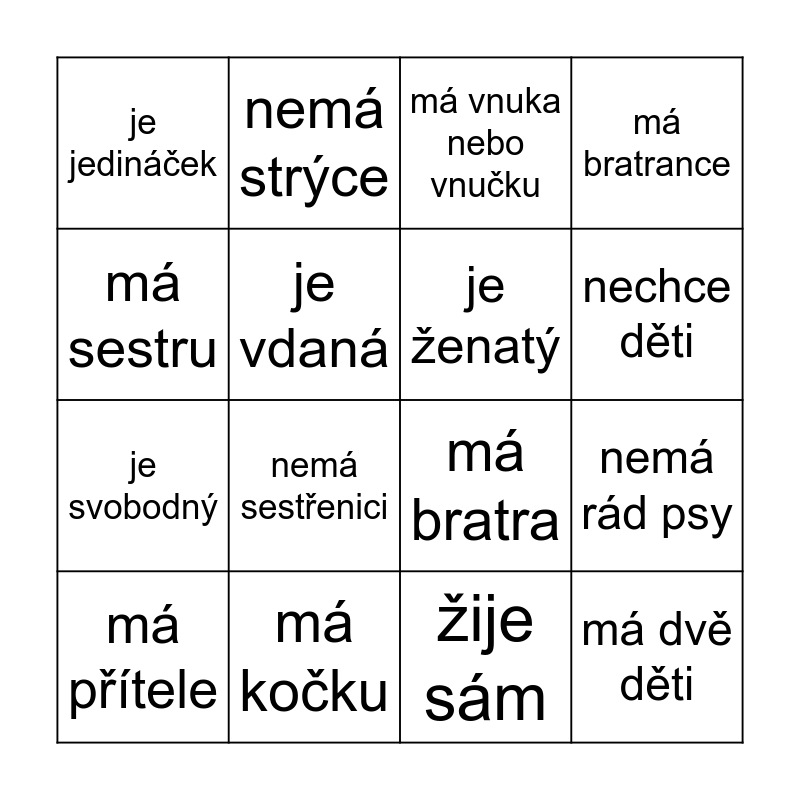 This bingo card has 16 words: má kočku, nemá rád psy, má vnuka nebo vnučku, je jedináček, je svobodný, nemá strýce, má bratra, žije sám, má sestru, je vdaná, má přítele, má bratrance, nemá sestřenici, nechce děti, je ženatý and má dvě děti.