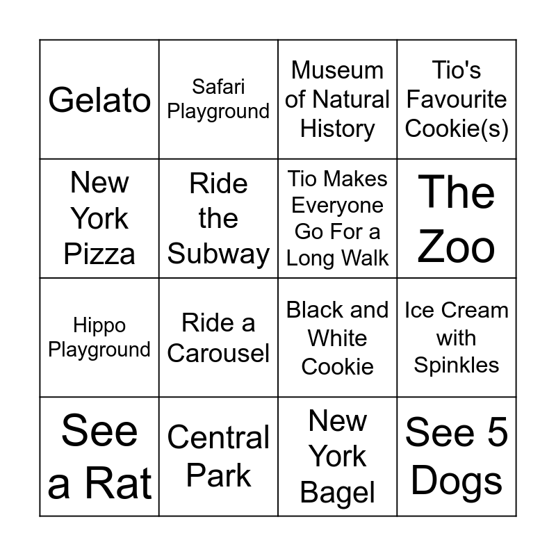 This bingo card has 16 words: Central Park, Ice Cream with Spinkles, Museum of Natural History, Gelato, Hippo Playground, Safari Playground, Black and White Cookie, New York Bagel, New York Pizza, Ride the Subway, See a Rat, Tio's Favourite Cookie(s), Ride a Carousel, The Zoo, Tio Makes Everyone Go For a Long Walk and See 5 Dogs.