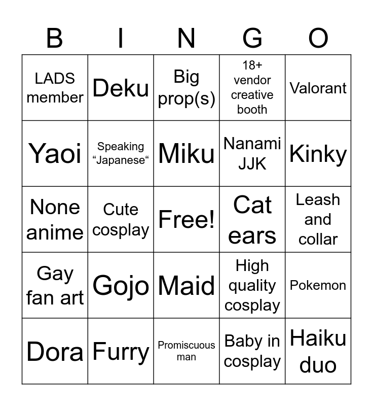 This bingo card has a free space and 24 words: Gojo, Furry, Miku, Dora, Valorant, LADS member, Yaoi, Deku, Cat ears, Maid, Nanami JJK, None anime, High quality cosplay, Pokemon, Speaking “Japanese“, Baby in cosplay, Leash and collar, Big prop(s), Kinky, Cute cosplay, Haiku duo, Gay fan art, 18+ vendor creative booth and Promiscuous man.