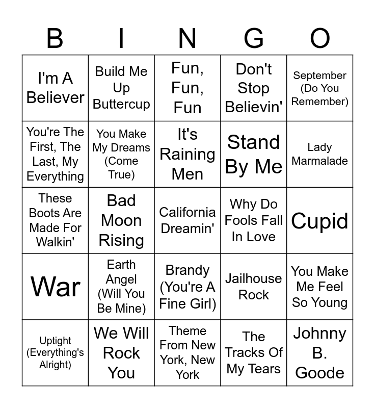 This bingo card has 90 words: Livin' On A Prayer, Leader Of The Pack, Brandy (You're A Fine Girl), I Want To Hold Your Hand, Suspicious Minds, Don't Be Cruel, (Your Love Keeps Lifting Me) Higher & Higher, Beyond The Sea, What A Wonderful World, I Heard It Through The Grapevine, Chantilly Lace, Billie Jean, Stand By Your Man, Cupid, Wake Me Up Before You Go-Go, It's Raining Men, La Bamba, I Saw Her Standing There, Don't Go Breaking My Heart, Daydream Believer, Blueberry Hill, Dancing Queen, Theme From New York, New York, If I Could Turn Back Time, These Boots Are Made For Walkin', We Will Rock You, You Can't Hurry Love, That's Amore, Y.M.C.A., All I Have To Do Is Dream, Midnight Train To Georgia, You Make Me Feel So Young, Tequila, War, I'm A Believer, Don't Stop Believin', Fun, Fun, Fun, Killing Me Softly With His Song, Bad Moon Rising, Lady Marmalade, Uptight (Everything's Alright), You're The First, The Last, My Everything, Son Of A Preacher Man, Rhinestone Cowboy, Girls Just Want To Have Fun, Jailhouse Rock, At The Hop, Whole Lotta Shakin' Going On, Piano Man, Tutti Frutti, Stayin' Alive, Stand By Me, Sweet Caroline, You're So Vain, Saturday In The Park, Your Song, Why Do Fools Fall In Love, All Night Long, Different Drum, The Great Pretender, I Wanna Dance With Somebody (Who Loves Me), Hotel California, Uptown Girl, Rocket Man, Just The Way You Are, Joy To The World, Mrs. Robinson, The Tracks Of My Tears, Play That Funky Music, Mack The Knife, Earth Angel (Will You Be Mine), California Dreamin', Baby Love, I Will Survive, Build Me Up Buttercup, You Make My Dreams (Come True), Take Me Home, Country Roads, All Shook Up, Yakety Yak, It's The Same Old Song, Johnny B. Goode, September (Do You Remember), Oh, Pretty Woman, Superstition, Let's Get It On, Brown Sugar, (Sittin' On) The Dock Of The Bay, Then He Kissed Me, (We're Gonna) Rock Around The Clock and Lean On Me.