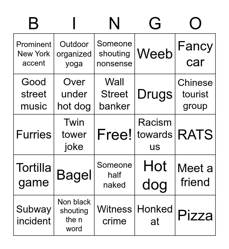 This bingo card has a free space and 24 words: Bagel, Non black shouting the n word, Wall Street banker, Subway incident, Fancy car, Prominent New York accent, Good street music, Outdoor organized yoga, Racism towards us, Someone half naked, Drugs, Furries, Hot dog, Meet a friend, Over under hot dog, Honked at, RATS, Someone shouting nonsense, Chinese tourist group, Twin tower joke, Pizza, Tortilla game, Weeb and Witness crime.