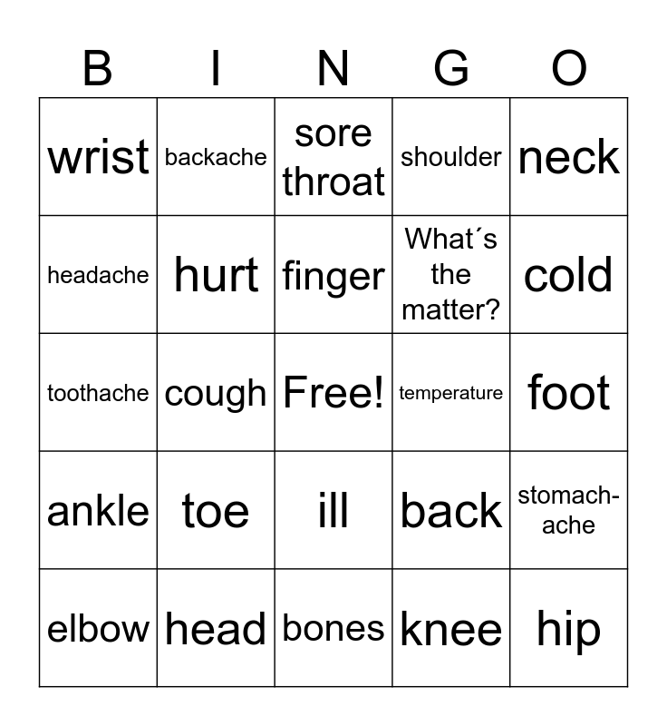 This bingo card has a free space and 24 words: toe, head, finger, elbow, neck, wrist, headache, backache, temperature, ill, What´s the matter?, toothache, back, stomach-ache, hurt, knee, foot, sore throat, cold, cough, hip, ankle, shoulder and bones.