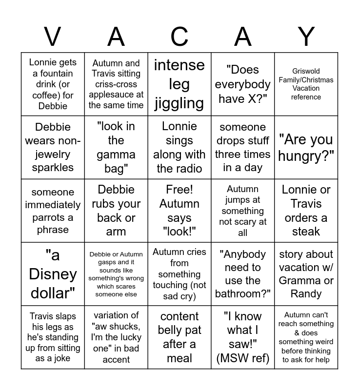 This bingo card has a free space and 24 words: Debbie or Autumn gasps and it sounds like something's wrong which scares someone else, variation of "aw shucks, I'm the lucky one" in bad accent, Lonnie sings along with the radio, Travis slaps his legs as he's standing up from sitting as a joke, Griswold Family/Christmas Vacation reference, Lonnie gets a fountain drink (or coffee) for Debbie, Debbie wears non-jewelry sparkles, Autumn and Travis sitting criss-cross applesauce at the same time, Autumn jumps at something not scary at all, Autumn cries from something touching (not sad cry), someone drops stuff three times in a day, someone immediately parrots a phrase, "Anybody need to use the bathroom?", story about vacation w/ Gramma or Randy, "look in the gamma bag", "I know what I saw!" (MSW ref), Lonnie or Travis orders a steak, intense leg jiggling, "Are you hungry?", Debbie rubs your back or arm, Autumn can't reach something & does something weird before thinking to ask for help, "a Disney dollar", "Does everybody have X?" and content belly pat after a meal.
