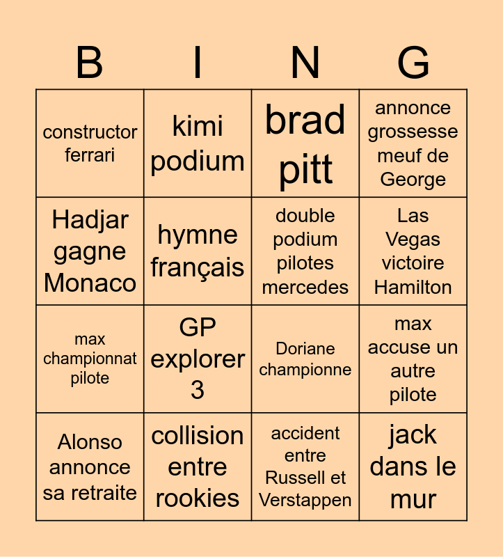 This bingo card has 16 words: collision entre rookies, max accuse un autre pilote, brad pitt, constructor ferrari, max championnat pilote, kimi podium, Doriane championne, accident entre Russell et Verstappen, Hadjar gagne Monaco, hymne français, Alonso annonce sa retraite, annonce grossesse meuf de George, GP explorer 3, Las Vegas victoire Hamilton, double podium pilotes mercedes and jack dans le mur.