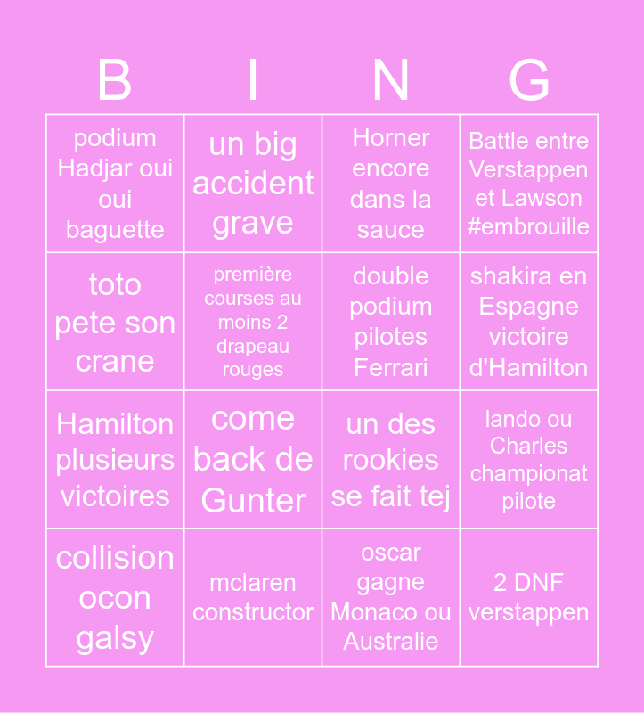 This bingo card has 16 words: mclaren constructor, lando ou Charles championat pilote, Horner encore dans la sauce, podium Hadjar oui oui baguette, Hamilton plusieurs victoires, un big accident grave, un des rookies se fait tej, oscar gagne Monaco ou Australie, toto pete son crane, première courses au moins 2 drapeau rouges, collision ocon galsy, Battle entre Verstappen et Lawson #embrouille, come back de Gunter, shakira en Espagne victoire d'Hamilton, double podium pilotes Ferrari and 2 DNF verstappen.