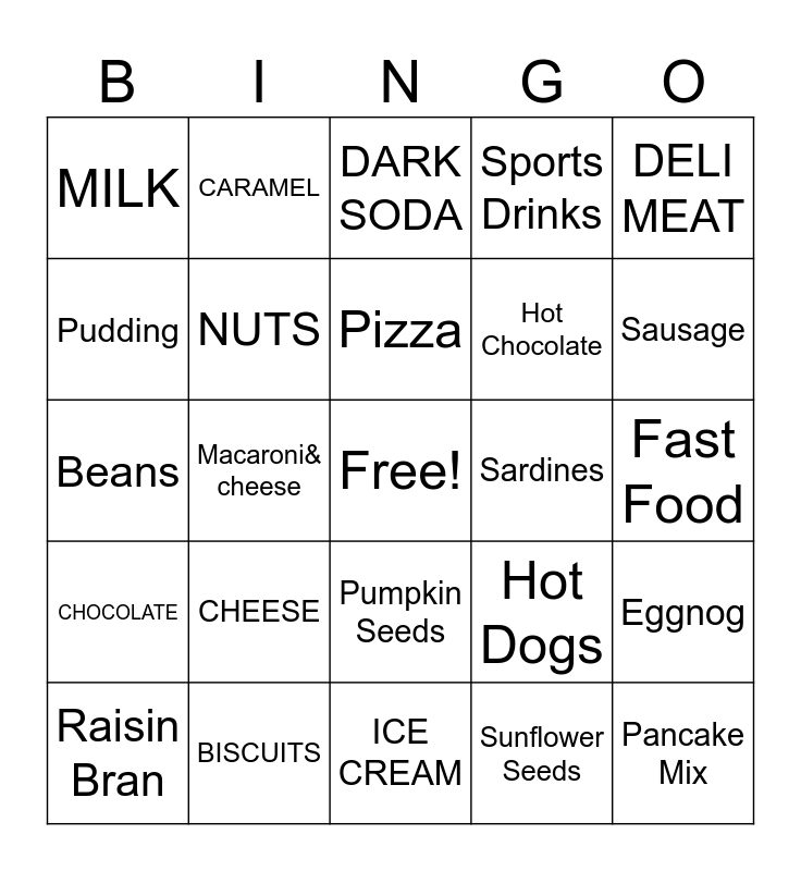 This bingo card has a free space and 24 words: CHEESE, BISCUITS, Pizza, Raisin Bran, DELI MEAT, MILK, Pudding, CARAMEL, Sardines, Pumpkin Seeds, Hot Chocolate, Beans, Hot Dogs, Eggnog, NUTS, Sunflower Seeds, Fast Food, DARK SODA, Sausage, Macaroni& cheese, Pancake Mix, CHOCOLATE, Sports Drinks and ICE CREAM.