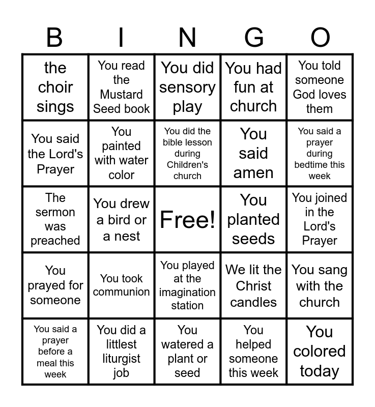 This bingo card has a free space and 24 words: You took communion, You did a littlest liturgist job, You did the bible lesson during Children's church, You said a prayer before a meal this week, You told someone God loves them, the choir sings, You said the Lord's Prayer, You read the Mustard Seed book, You planted seeds, You played at the imagination station, You said amen, The sermon was preached, We lit the Christ candles, You sang with the church, You painted with water color, You helped someone this week, You joined in the Lord's Prayer, You did sensory play, You said a prayer during bedtime this week, You drew a bird or a nest, You colored today, You prayed for someone, You had fun at church and You watered a plant or seed.
