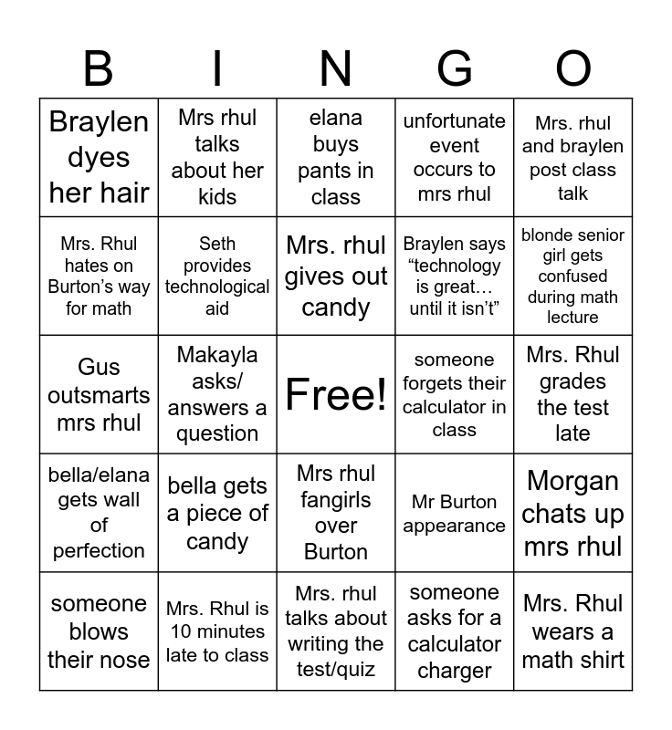 This bingo card has a free space and 28 words: Mrs Rhul goes on a “tangent”, Mrs. Rhul is 10 minutes late to class, Mrs. rhul gives out candy, someone asks for a calculator charger, Mrs. rhul and braylen post class talk, Braylen dyes her hair, Seth provides technological aid, Mrs. rhul talks about writing the test/quiz, someone forgets their calculator in class, Morgan chats up mrs rhul, Gus outsmarts mrs rhul, Makayla asks/ answers a question, Mr Burton appearance, Mrs. Rhul wears a math shirt, Mrs. Rhul hates on Burton’s way for math, seth talks about chem, Mrs rhul fangirls over Burton, unfortunate event occurs to mrs rhul, blonde senior girl gets confused during math lecture, someone blows their nose, Mrs rhul talks about her kids, Mrs. Rhul’s loud laugh, Braylen says “technology is great…until it isn’t”, Mrs. Rhul grades the test late, bella/elana gets wall of perfection, bella gets a piece of candy, elana buys pants in class and Mrs rhul wears non sneakers.