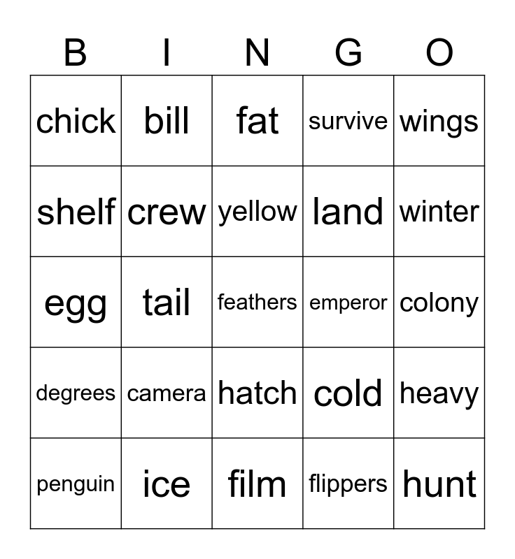 This bingo card has a free space and 24 words: penguin, camera, yellow, flippers, wings, chick, bill, fat, emperor, colony, egg, crew, cold, heavy, shelf, ice, film, survive, winter, degrees, tail, hatch, land and hunt.
