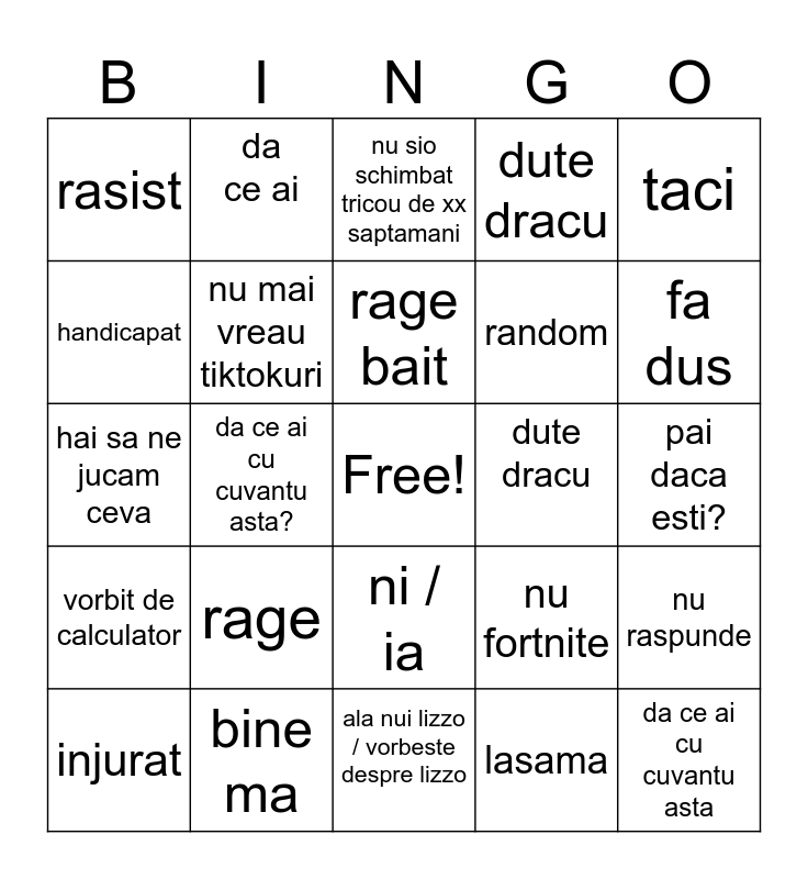 This bingo card has a free space and 24 words: rage, bine ma, rage bait, injurat, taci, rasist, handicapat, da ce ai, dute dracu, ni / ia, random, hai sa ne jucam ceva, nu fortnite, nu raspunde, nu mai vreau tiktokuri, lasama, pai daca esti?, nu sio schimbat tricou de xx saptamani, fa dus, da ce ai cu cuvantu asta?, da ce ai cu cuvantu asta, vorbit de calculator, dute dracu and ala nui lizzo / vorbeste despre lizzo.